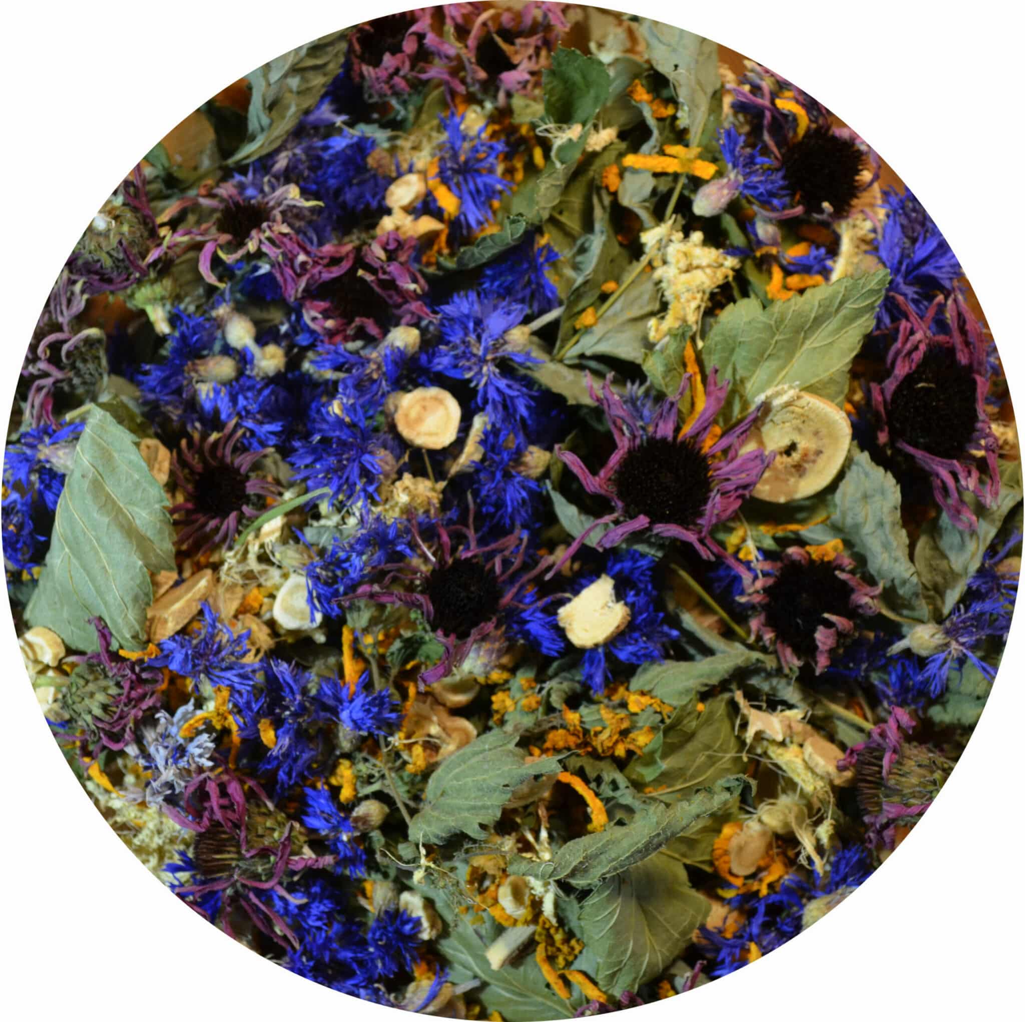 Ingrédients : Ortie (feuille), Frêne (feuille), cassis (feuille), Sureau noir (baie), Patience crépue (racine), Gingembre (racine), Curcuma (racine), Ashwagandha (racine), Astragale (racine), Eleutherocoque (racine), Bleuet (fleur), Echinacée (fleur).
